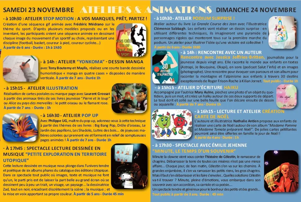 Initiation à la technique du pop up avec Philippe UG, lecture et réalisation d’une carte de Noël pour les petits avec l’album illustré « Madame Pomme et Madame Poire préparent Noël » de Nathalie Antien, atelier BD et atelier illustration avec l’illustrateur Laurent Grossat, atelier manga « Yonkoma » avec Tony et Maylis des éditions Kool Books, atelier d’écriture Haïku avec l’autrice Mary Aulne, création d'une séquence animée avec l’atelier stop motion de Frédéric Médrano...
