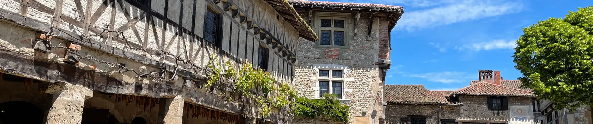 - La visite du village : les rues pavées de galets inégaux du lit de la Dombes, la Place du Tilleul bordée de maisons médiévales à colombages, l’église forteresse, les anciennes demeures de tisserand d’époque Renaissance avec leurs façades à encorbellement et leurs fenêtres à meneaux, le Musée du Vieux Pérouges…