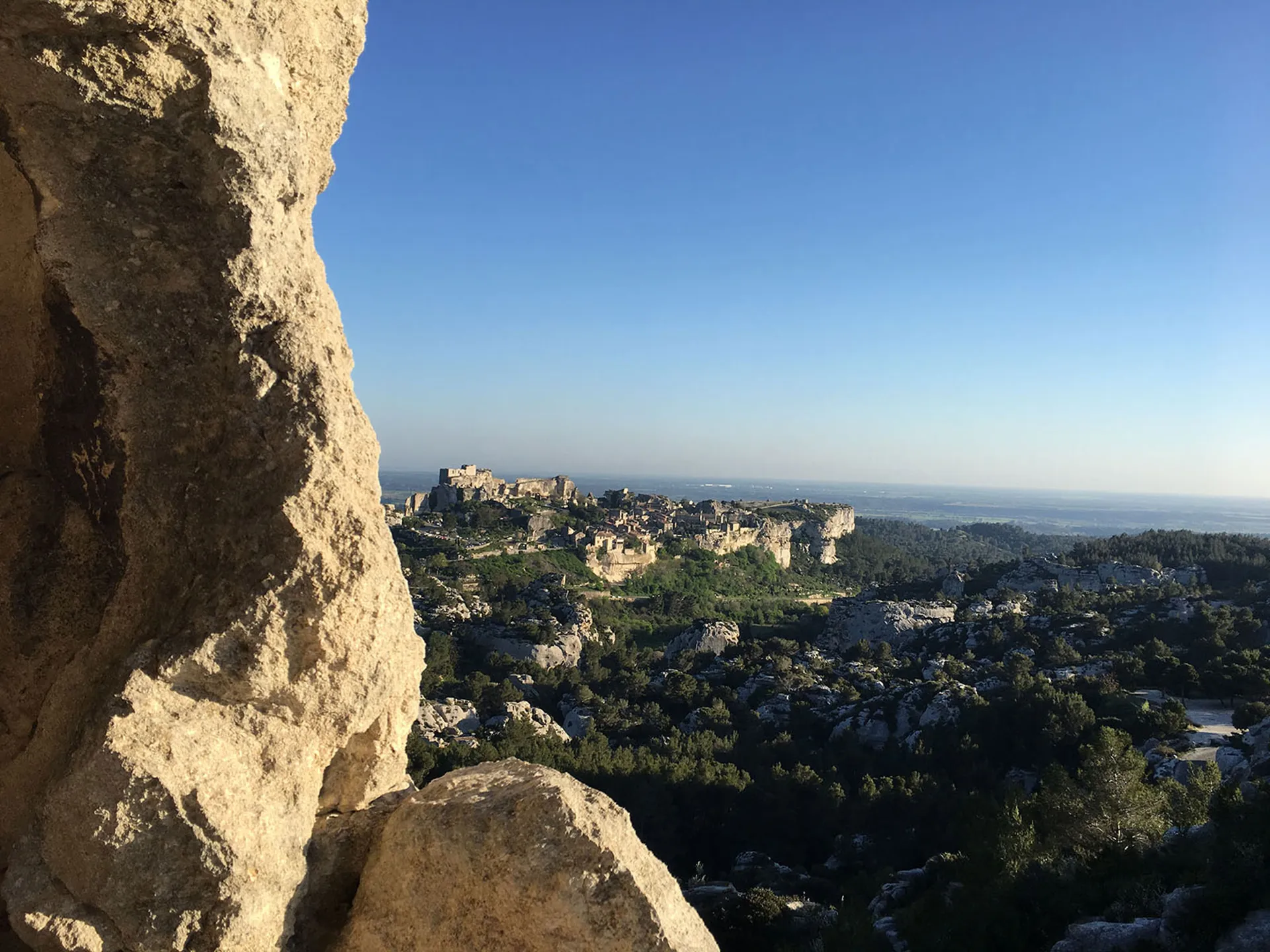 Du haut du village, la silhouette imposante du Château des Baux se démarque dans le ciel.