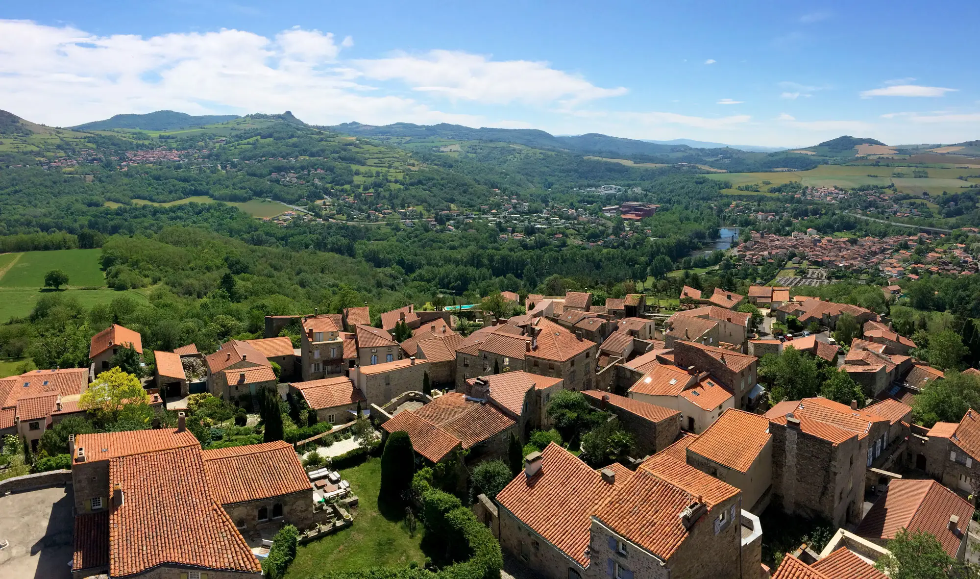 Sur l’autoroute A75, reliant Clermont-Ferrand à Montpellier au fil de paysages aussi exceptionnels que variés, Montpeyroux offre l’un des tous premiers points d’intérêt au départ de la capitale auvergnate. Depuis cet axe routier majeur, la bien-nommée « Méridienne », l’harmonieuse silhouette du village, enroulé au pied de son donjon, incite le visiteur à s’arrêter pour une incursion au Moyen Âge ! A cette époque, l’A75 se nommait « voie Régordane » et Montpeyroux avait pour illustres seigneurs Catherine de Médicis puis Marguerite de Valois, descendantes de la puissante famille de la Tour d’Auvergne. Le village reste caractéristique de l’organisation d’une cité médiévale de la région. De son système de défense ne subsistent que la magnifique porte fortifiée du XIVème siècle surmontée d’une horloge et l’imposante tour autrefois située au cœur de la forteresse. S’élevant sur trois étages, sa plateforme crénelée permettait de surveiller aussi bien les risques d’attaques que ceux liés aux incendies ou aux crues de l’Allier tout proche. Accessible au visiteur, l’édifice offre une vue plongeante sur les toits du village et un point de vue unique sur la chaîne des puys, le massif du Sancy et les monts du Cantal.